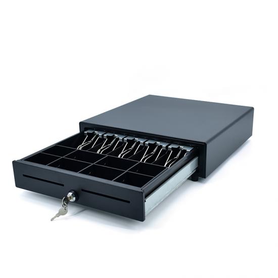 کشوی پول اتوماتیک با بدنه مقاوم از جنس فولاد ضدزنگ و سینی و ریل فلزی از جنس آلومینیوم، دارای محفظه های تنظیم پذیر داخلی متشکل از 4 خانه با گیره فلزی برای اسکناس و 5 خانه قابل جابجایی برای پول خرد، مجهز به پورت RJ11/RJ12 جهت اتصال به فیش پرینتر